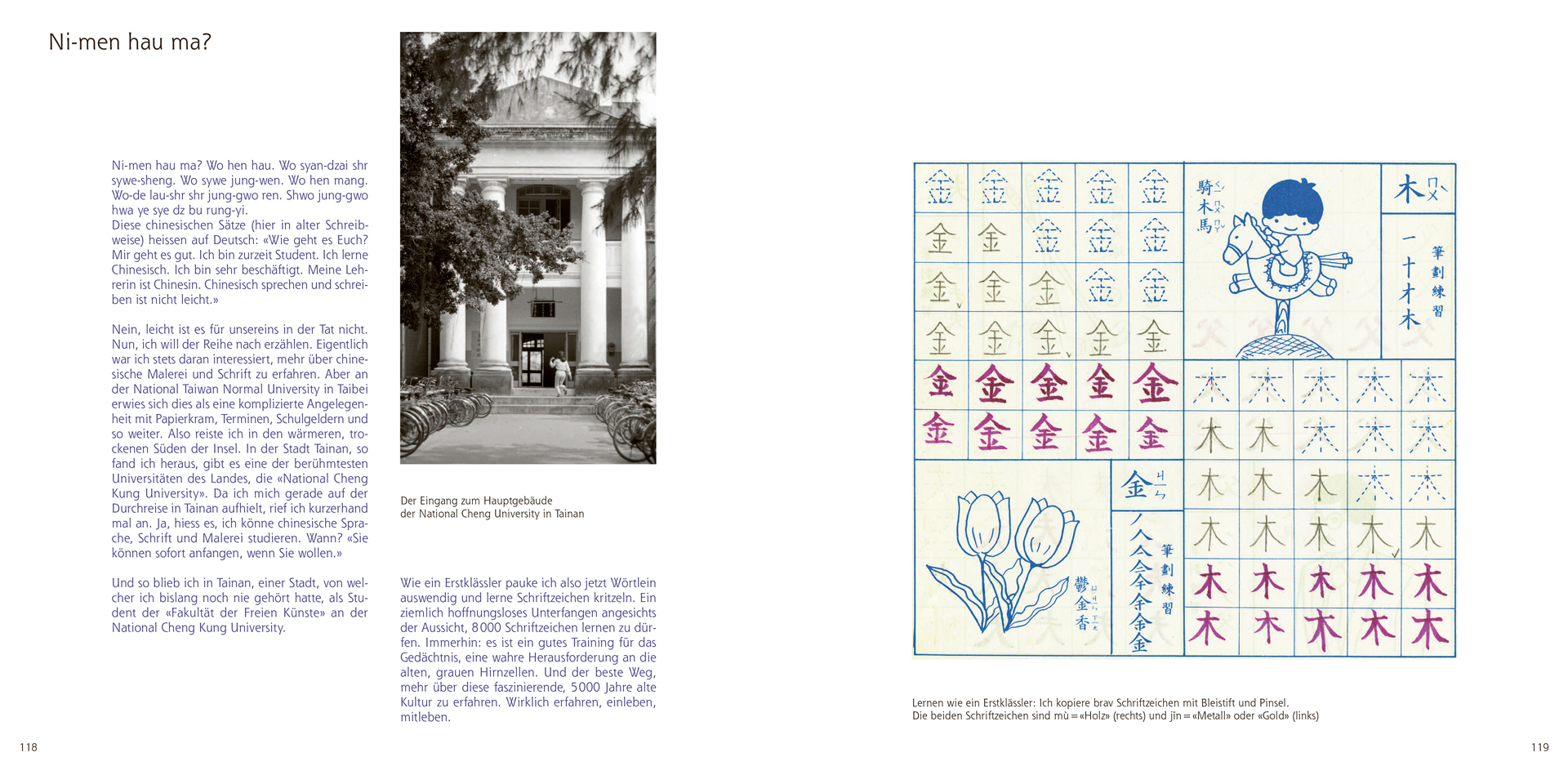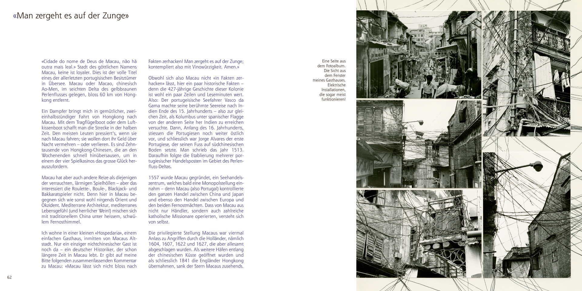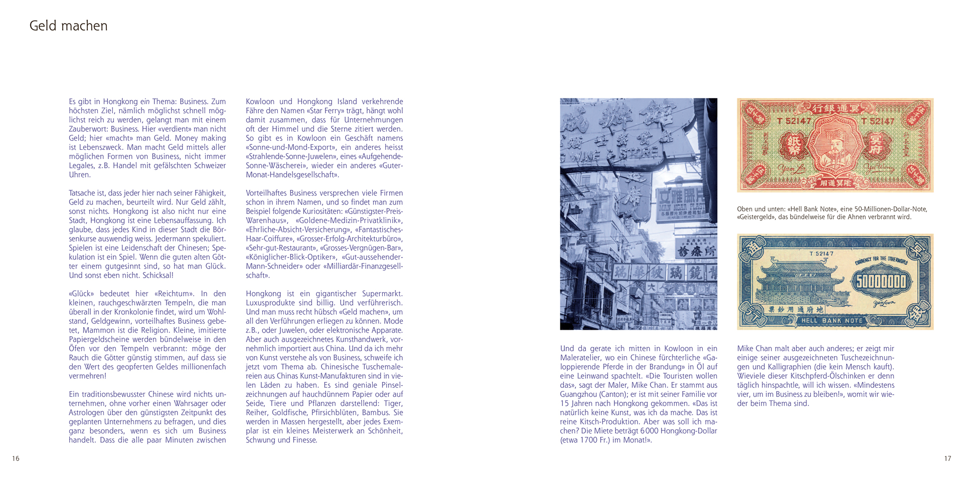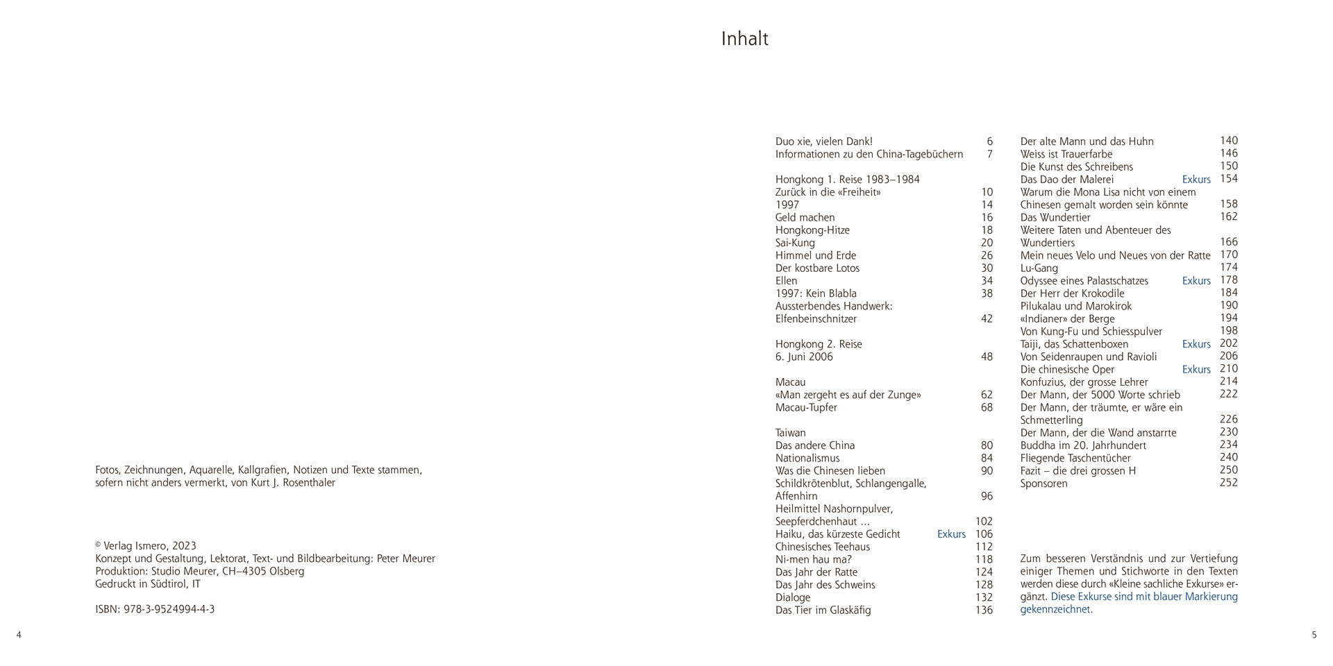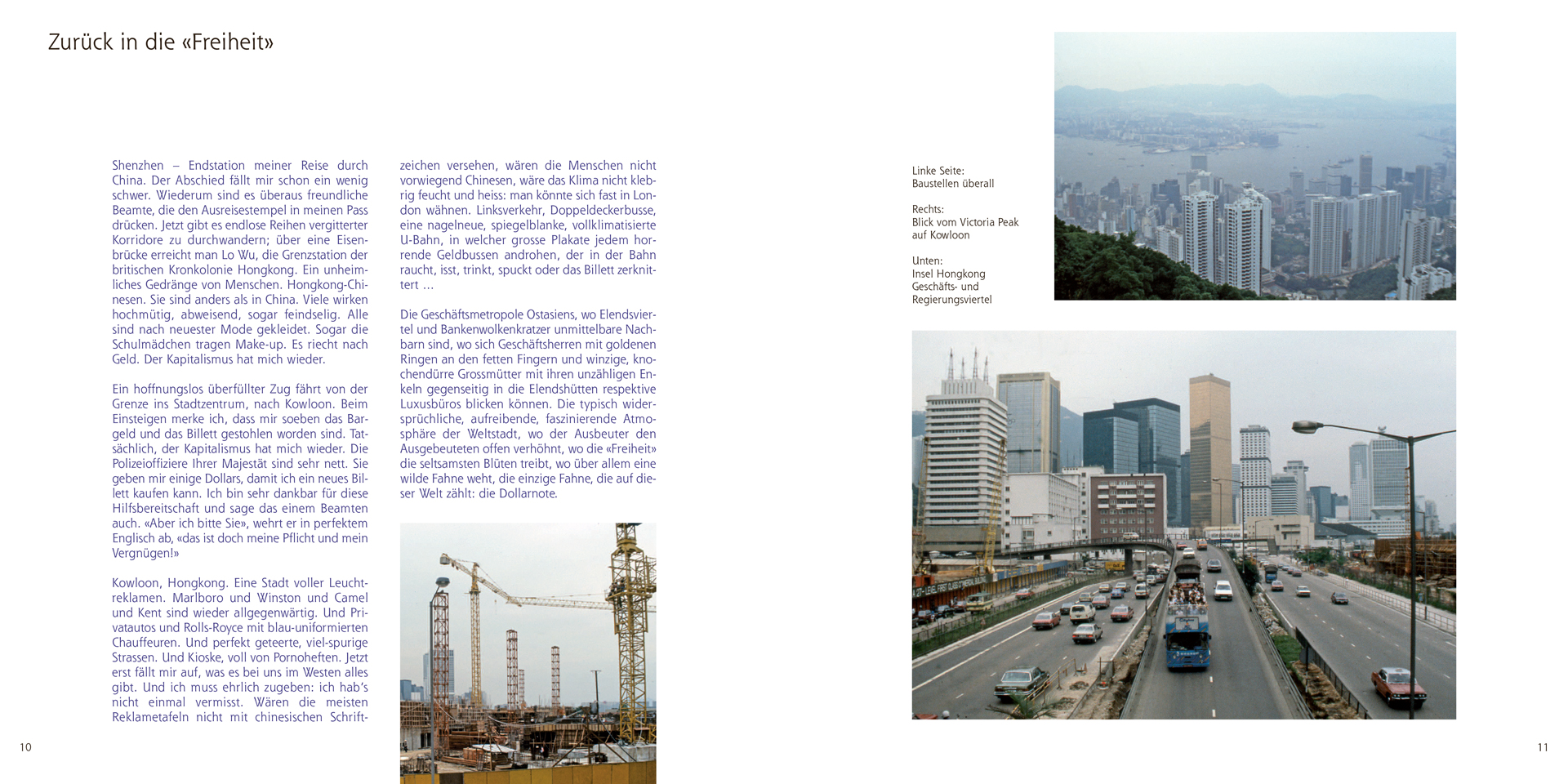 Tagebuchaufzeichnungen des Schweizer Journalisten und Künstlers Kurt J. Rosenthaler von seinen Reisen und Aufenthalten in Hongkong, Macau und Taiwan in den Jahren 1983 bis 1984. Er reiste solo, angetan mit Rucksack, Schlafsack, Fotokamera, Skizzenblock und Notizbuch. Er benützte ausschliesslich die öffentlichen Verkehrsmittel. Wöchentlich schickte er per Post seine handgeschriebenen Reise-Eindrücke, illustriert mit Fotos und Zeichnungen, an die «Fricktaler Zeitung» in Rheinfelden/Schweiz.