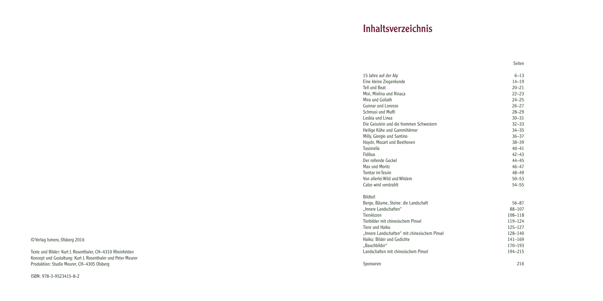 Der Hauptteil des Buches besteht aus den gezeichneten und gemalten Bildern, die unter einfachsten Bedingungen bei Sonne, Wind und Regen meist spontan entstanden sind. Ein Buch, welches das einfache, authentische Leben und Arbeiten mit so genannten «Nutztieren», nämlich Ziegen, Schafen, Schweinen und Hunden zeigt – Tieren, die Kurt J. Rosenthaler damals ans Herz gewachsen sind.