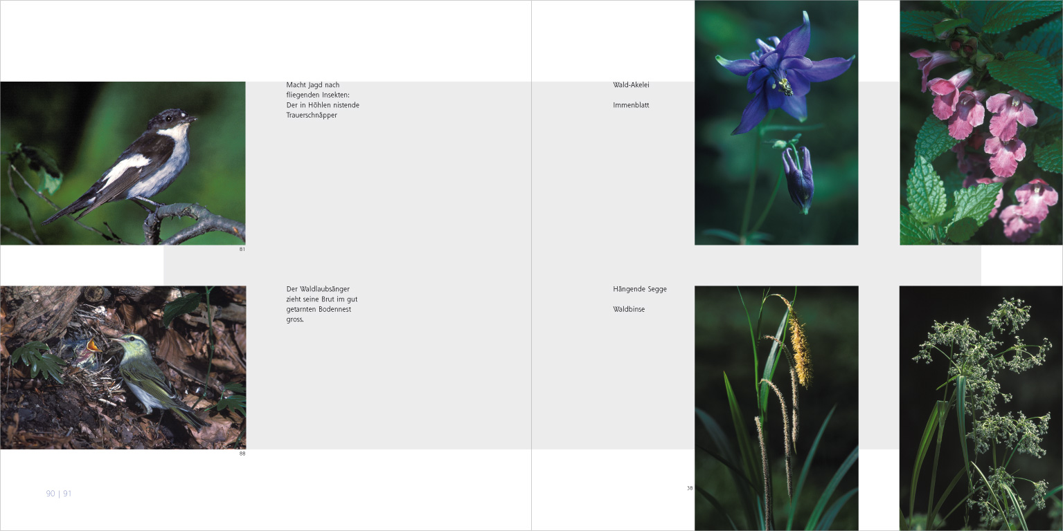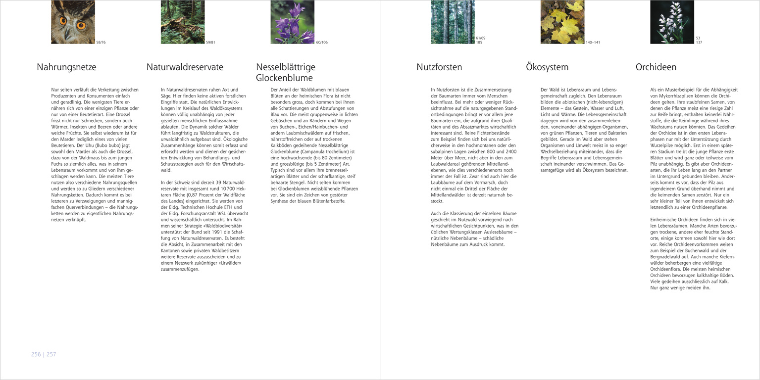 Ausführliche Kommentare zu den Bildern geben im zweiten Buchteil fundiert Auskunft über die abgebildeten Tier- und Pflanzenarten sowie massgebende ökologische Zusammenhänge im Lebensraum Wald.