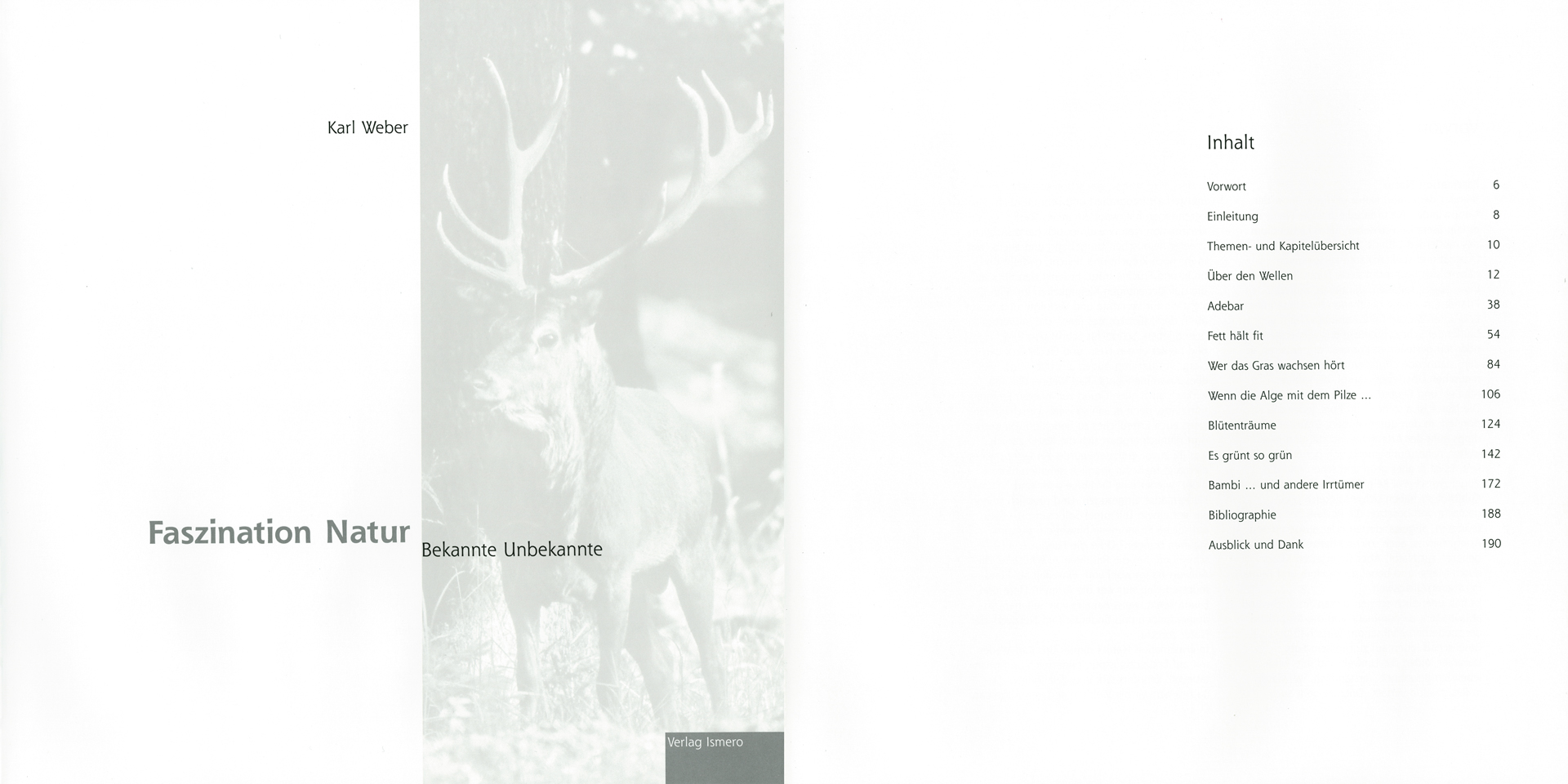 Mit Faszination Natur präsentiert der Rheinfelder Naturfotograf und Publizist Karl Weber nach «Erlebnis Wald» ein weiteres, zweibändiges Werk, beim Verlag Ismero. Es basiert auf einer zwischen 1999 und 2005 in einer renommierten Schweizer Monatszeitschrift veröffentlichten naturkundlichen Reportageserie. Diese fand mit ihrer Themenvielfalt bei der Leserschaft grossen Anklang und hatte zahlreiche Anregungen bezüglich einer Herausgabe in Buchform zur Folge. In Zusammenarbeit von Autor und Verlag entstand die vorliegende Auswahl an Themen und Bildern aus dem grossen Fundus von Karl Webers Lebenswerk.