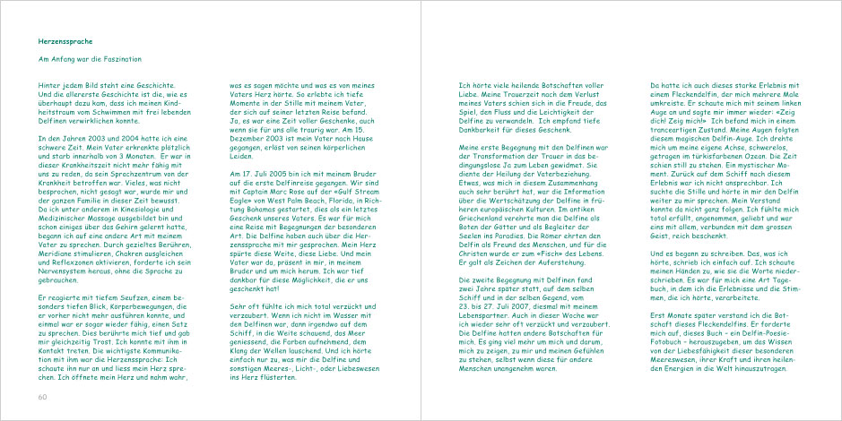 Die Autorin sieht sich zunehmend in ihrer Erfahrung bestärkt, dass diese Meeressäuger auf einer sehr hohen Entwicklungsstufe stehen und die Fähigkeit haben, mit uns Menschen in Kontakt zu treten. Lassen Sie sich spielerisch darauf ein, und schon erzählt Ihnen jedes Bild in diesem Buch eine Geschichte!
